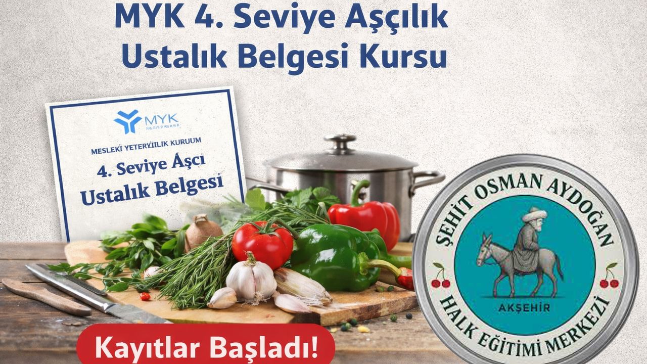 Akşehir Şehit Osman Aydoğan Halk Eğitim Merkezi tarafından, Mesleki Yeterlilik Kurumu (MYK) 4. Seviye Aşçılık (Ustalık) Belgesi Kursu açılıyor. Aşçılık mesleğinde resmî ve geçerli bir belgeye sahip olmak isteyen kursiyer adayları için kayıtlar alınmaya başlandı.