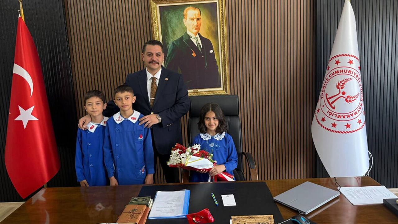 Yunak Kaymakamı Can Alperen Taşavlı, kaymakamlık makamını geçici olarak Hacı Tekin İlkokulu öğrencileri Sare Nur Çevik, Arda Efe Donat ve Murat Telis'e devretti.